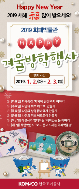 한국조폐공사(사장 조용만) 화폐박물관(대전 유성구 소재)은 겨울방학을 맞아 공기업의 사회적 책임을 완수하고 국민과 함께 하는 박물관 조성을 위해 ‘2019 화폐박물관과 함께하는 HAPPY 겨울방학 행사’를 개최한다.