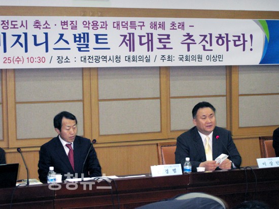 이상민의원은 주제발표를 통해 “국제과학비지니스벨트 국책사업이 탄생하게 된 배경에 정치적 의혹이 있다. 정부가 고도의 정치적 고려로 행정도시에 이전할 부처를 축소하고 지역 반발을 무마하기 위해 대신 국제과학비즈니스벨트 카드를 꺼낸 것으로 인해 행정도시거 축소변질될 우려가 있고, 대덕특구가 유명무실화되어 해체를 초래하게 될 것”이라고 문제제기를 했다.