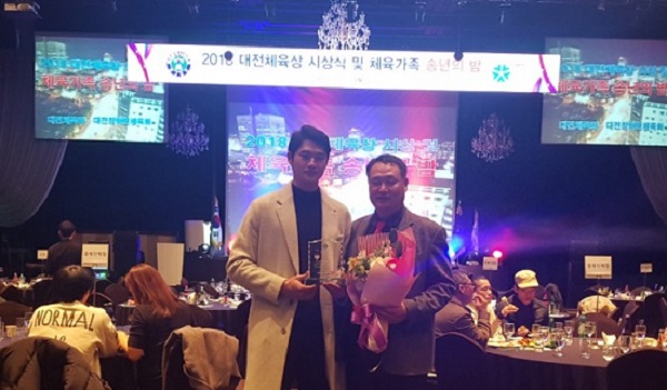 21일 대전대학교(총장 이종서) 펜싱부에 따르면 오상욱 선수<사진 왼쪽>가 지난 20일 도룡동 ICC호텔에서 개최한 ‘2018 대전체육상 시상식 및 체육가족 송년의 밤’에서 선수부문 체육대상을 수상했다.