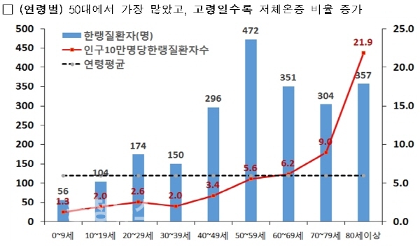 연령대별로는 50대에서 472명의 한랭질환자가 발생해 가장 많았고, 60대 251명, 70대 304명, 80세 이상 357명 등 고령일수록 저체온증과 같은 중증한랭 질환이 많았다.