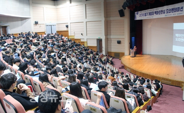 충남대 인재개발원은 12월초에 진행된 사전교육과 지난 21일, ‘동기계절제 백마인턴십(현장실습) 오리엔테이션’을 개최했다, 이날 오리엔테이션에 참석한 약 400명의 충남대 재학생들은 24일부터 4주, 8주간 대전지역의 연구소, 중견기업, 강소기업, 스타트업 등 100여개 기업에서 인턴십을 수행한다.