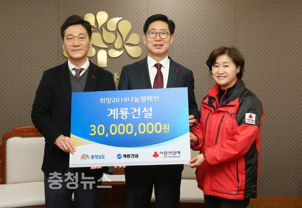 계룡건설 이승찬 사장은 지난 21일  충남 홍성에 위치한 충남도청에서 양승조 충남도지사, 박은희 충남사회복지공동모금회 사무처장이 참석한 가운데 ‘희망 2019 나눔캠페인’ 성금 전달식을 가졌다.