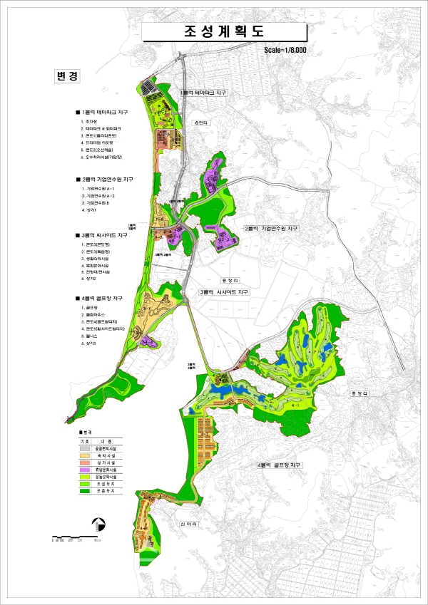 1지구 테마파크는 36만 9000㎡에 워터파크와 프리미엄 아울렛 등을, 3지구 ‘씨사이드’ 54만 4000㎡에는 호텔과 콘도를 건립한다. 4지구(159만 5000㎡)에는 퍼블릭골프장과 콘도, 상가 등을 건립할 계획이다.