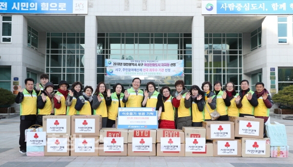 대전 서구 자원봉사협의회(회장 최미자)는 24일, 서구청 광장에서 어려운 이웃 290명에게 방한 내복을 전달하는 행사를 가졌다.