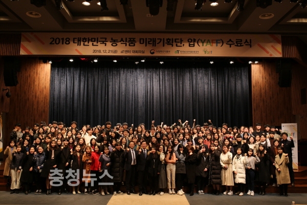 농림축산식품부(장관 이개호)와 한국농수산식품유통공사(aT, 사장 이병호)는 21일 양재동 aT센터 그랜드홀에서 '제5기 대한민국 농식품미래기획단(YAFF : Young Agri-Food Fellowship, 이하 ‘얍’)'의 2018년 수료식 및 성과보고회를 개최했다.