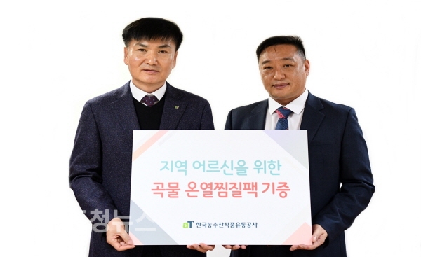 한국농수산식품유통공사(aT, 사장 이병호) 백진석 부사장은 지난 21일aT 임직원이 직접 제작한 온열찜질팩 100여개를 인근 요양병원 어르신들에게 전달하며 연말연시 이웃과 따듯한 정을 나눴다.