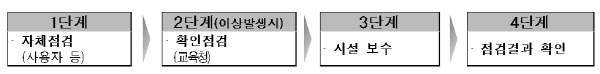 이번 점검은 총 4단계로 진행 할 예정이며, 자체 점검(관리주체) 후 이상 발견 시 교육청에서 확인점검반을 구성하여 점검 및 보수를 관리·감독 할 계획이다.