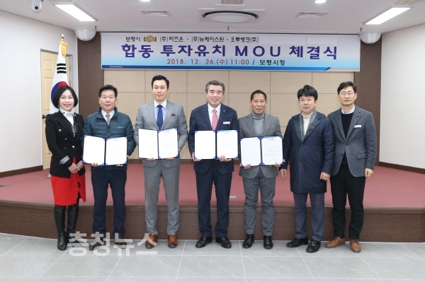 보령시는 26일 오전 시청 중회의실에서 김동일 시장과 이규현 ㈜라즈온 대표, 설진표 ㈜뉴페이스원 회장, 황석희 오투뱅크㈜ 대표 등 관계자가 참석한 가운데 3개 기업과의 합동 투자양해각서를 체결했다.