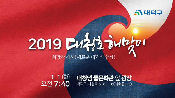 대전 대덕구(구청장 박정현)가 황금돼지해인 기해년(己亥年)을 맞아 희망찬 한 해를 기원하는 ‘2019 기해년 대청호 해맞이’ 행사를 오는 1월 1일 대청댐 물문화관 앞 광장에서 개최한다.