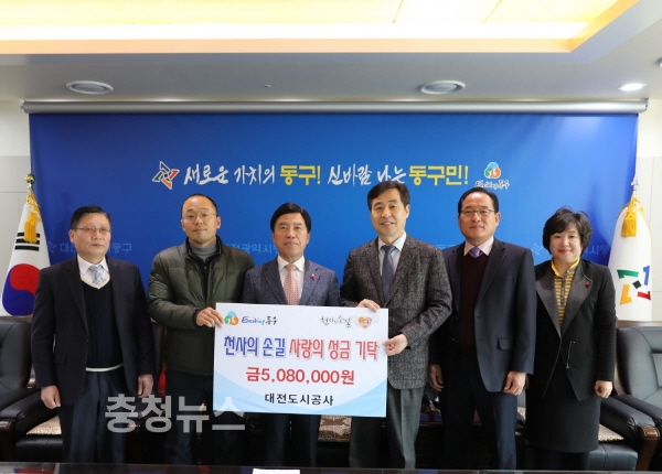 26일 오후 대전동구청장실에서 뜻깊은 성금전달식이 열렸다. 새벽마다 골목골목을 누비며 한해 대전시의 생활쓰레기와 음식물쓰레기를 수거하는 대전도시공사 소속 환경사원들이 정성껏 모은 성금 508만원을 동구청을 통해 관내 장애인복지시설에 전달했다.