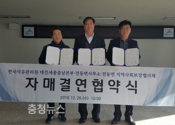 세종시 전동면(면장 전만익)과 전동면지역사회보장협의체가 26일 전동면사무소에서 한국석유관리원 대전세종충남본부(본부장 김완식)와 지역 내 소외계층 지원을 위한 자매결연 협약을 맺었다.