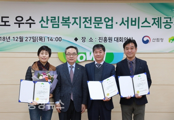 윤영균(좌측 두 번째) 한국산림복지진흥원장이 27일 대전 서구 둔산동 진흥원 대회의실에서 열린'2018년도 우수 산림복지전문업·서비스제공자 시상식'에서 우수 산림복지서비스제공자 관계자와 기념촬영을 하고 있다