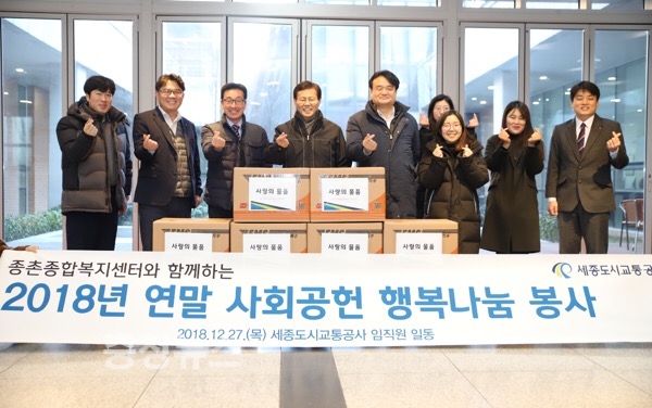 세종도시교통공사(사장 고칠진)는 27일 연말연시를 맞이하여 임직원들이 모금한 불우이웃돕기 성금으로 생필품을 구입하여 종촌종합복지센터의 협조를 받아 세종시에 거주하시는 소외계층에 전달하였다고 밝혔다.