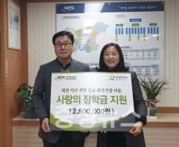 국민연금공단 대전지역본부(본부장 김종진)는 국민연금공단 대전지역본부장실에서 지역 내 위기가정 아동을 위한 장학금을 굿네이버스 대전서부지부(지부장 류현희)에 전달했다고 28일 밝혔다.