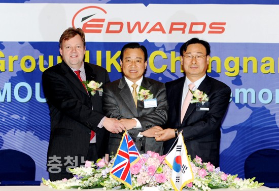 이완구 충남도지사, 박한규 천안부시장, 나이젤 헌튼(Nigel Hunton) 에드워드사 대표는 3월 4일, 서울 그랜드인터콘티넨탈호텔에서 약 4천5백만달러를 투자 드라이진공펌프1) 생산을 위한 협약(MOU)를 체결하였다