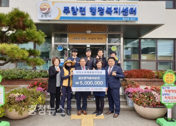 . 지난달 27일 골프존카운티 순천의 임직원들이 순천시 주암면사무소를 방문해 성금 500만 원을 전달했다.