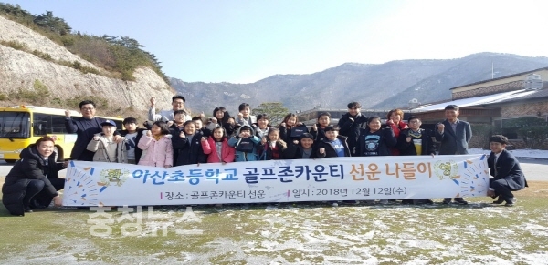 이달 12일 골프존카운티 선운에 방문한 아산초등학교 학생들이 기념사진 촬영을 하고 있다.