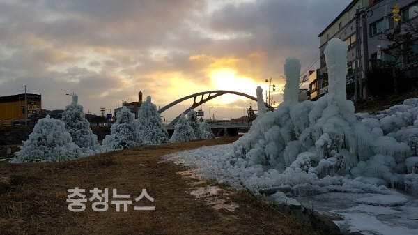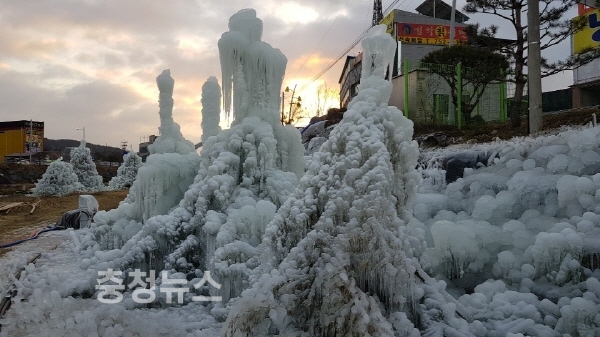 충남 금산군 금산천 인공폭포 주변에 조성된 얼음 조각상들이 저마다 자태를 뽐내고 있다. LED 조명 설치로 멋스런 야경도 새롭다.