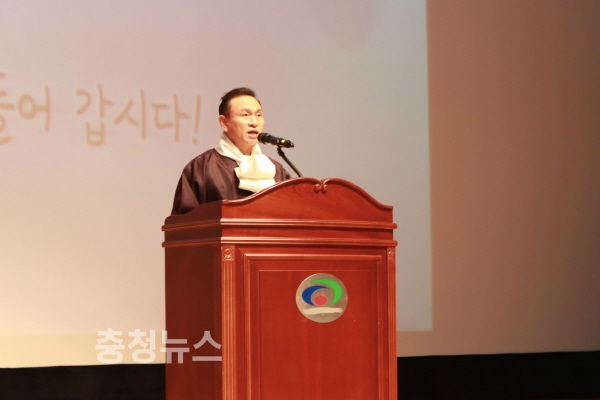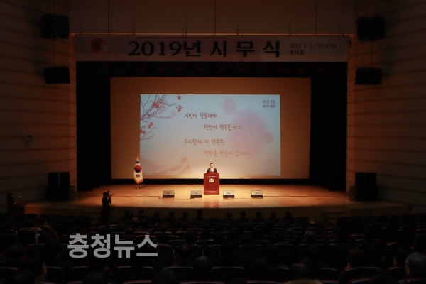 충남 천안시가 2일 시청 봉서홀에서 구본영 시장을 비롯한 전 직원이 참석한 가운데 2019년 시무식을 개최하고 더 큰 천안, 더 큰 행복을 실현하기 위해 전력을 다할 것을 다짐했다.