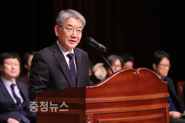 상명대학교 2019년 시무식에서 백웅기 총장이 신년사를 하고 있다.