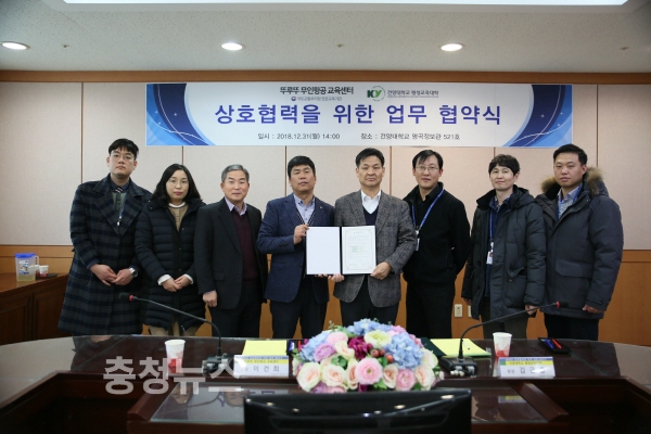 건양대학교(총장 이원묵) 평생교육대학(원장 김근종)은 지난달 31일 오후 건양대 논산 창의융합캠퍼스 명곡정보관에서 국토교통부 지정 전문교육기관인 ㈜뚜루뚜 무인항공교육센터(원장 이건희)와 업무협약을 체결하고 2019년 상반기부터 드론 교육과정을 개설해 운영하기로 했다.