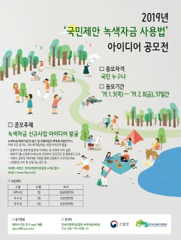 산림청 한국산림복지진흥원(원장 윤영균, 이하 진흥원)은 내달 8일까지 복권기금 녹색자금 신규사업 발굴을 위해 ‘2019년 국민제안 녹색자금 사용법’ 아이디어 공모전을 실시한다고 3일 밝혔다.
