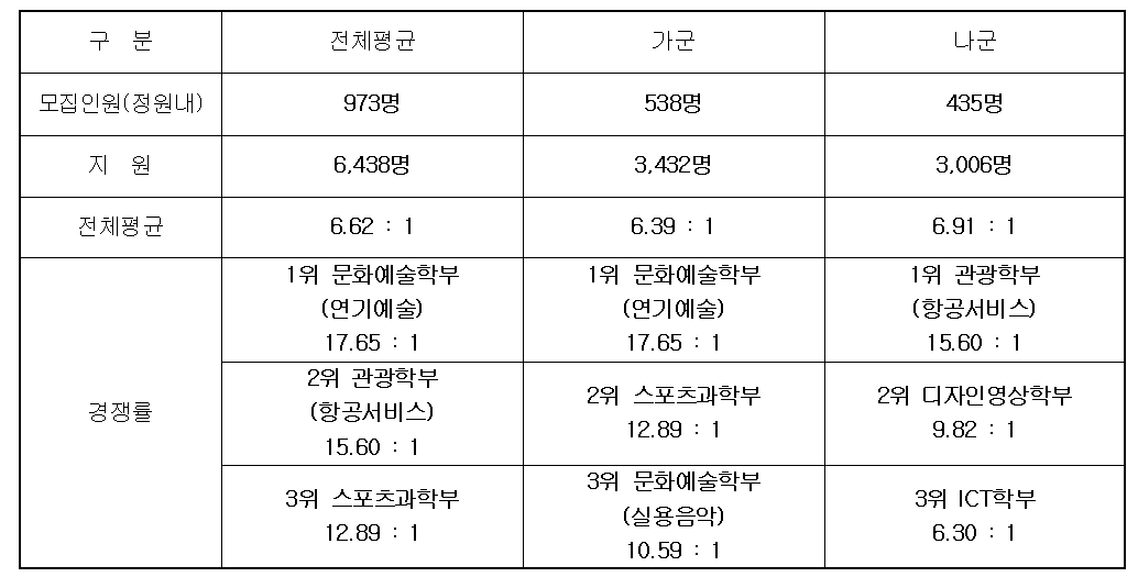 나군에서는 관광학부(항공서비스) 일반전형이 10명 모집에 156명이 지원해 15.60:1, 디자인영상학부 9.82:1, ICT학부 6.30:1 순으로 경쟁률이 높았다.