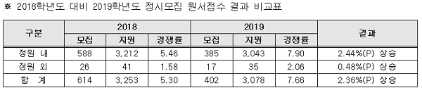 한편 2018학년도 정시모집 원서 접수에서 정원 내 3212명이 지원, 평균 경쟁률 5.46대 1을 기록했다. 따라서 2019학년도 정시모집 원서접수는 전년 대비 2.44%P 상승했다.
