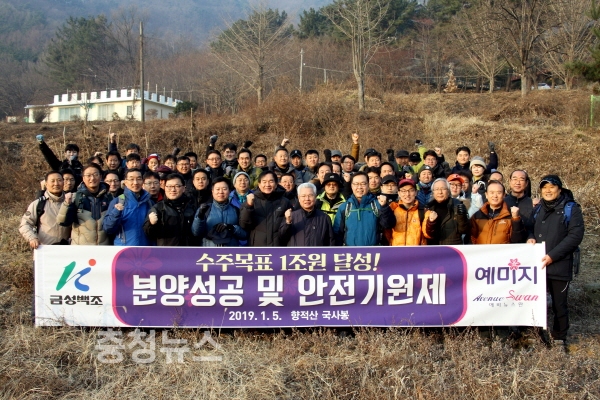 금성백조주택(회장 정성욱) 임직원 100여명이 지난 5일 충남 계룡시 향적산 국사봉에 올라 수주목표 1조원 달성, 분양성공, 무재해 무사고를 기원하는 안전기원제를 올렸다.