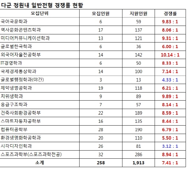 또 스포츠과학부의 경우 32명 모집에 286명이 지원, 평균 8.94대 1의 경쟁률을 기록했고, 글로벌소프트웨어과는 61명이 지원해 8.71대 1의 경쟁률을 보였의며, 건축사회환경공학부의 경우 22명 모집에 189명이 지원, 평균 8.44대 1의 경쟁률을 기록했다.