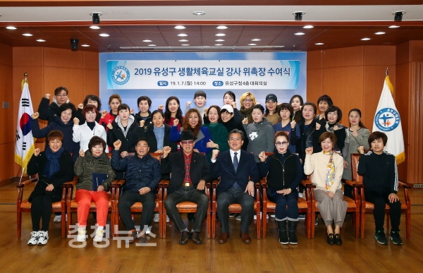 7일 유성구청 대회의실에서 정용래 유성구청장(앞줄 오른쪽에서 네 번째)이 유성구 생활체육교실 강사 35명을 위촉하고 기념촬영을 하고 있다.