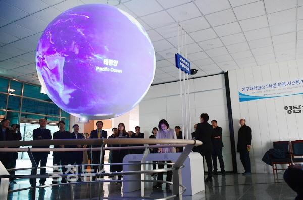 ‘지구과학현상 3차원 투영시스템’은 지구를 포함한 행성의 대기, 해양, 지질 및 천문우주 현상을 구(球)위에 3차원 영상으로 표출하는 최첨단 가시화 시스템이다.