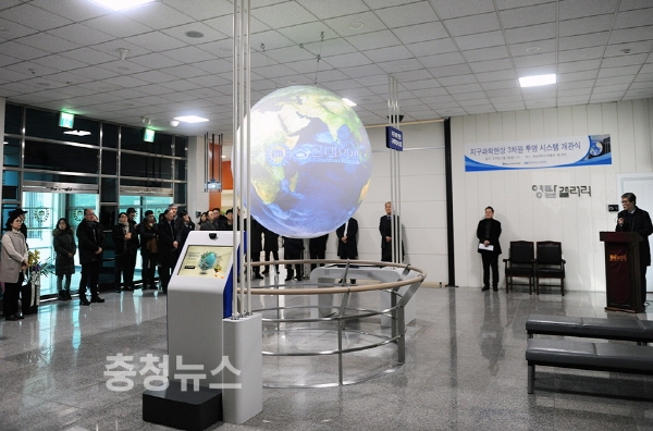 충남대학교에 지구 및 천문우주 현상을 3차원 영상으로 보여주는 구체 투영시스템이 설치돼 일반에 공개됐다.