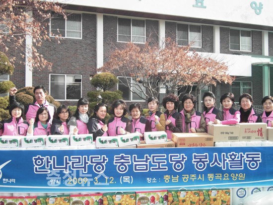 한나라당 충남도당(김태흠 도당위원장)은 3월 12일(목) 오전10시 부터 오후 1시 까지 공주시 반포면 송곡리 188-7 번지에 위치한 동곡요양원(중증장애인 요양시설)에서 장애우들을 위한 목욕봉사와 빨래하기, 소각장청소 등 봉사활동을 실시하고 당원들의 정성으로 모아진 위문품을 전달했다.