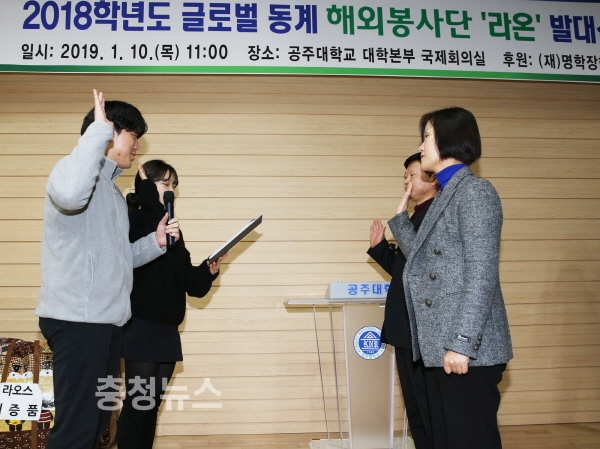 한편, 공주대 글로벌 동계 해외봉사 활동 발대식은 10일 국제회의실에서 학생지원처 한혁 처장을 비롯한 관계자와 단원 31명 등이 참석한 가운데 진행됐다.