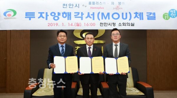 충남 천안시는 지난 14일 시청 소회의실에서 우량기업 ㈜홈플러스(대표 임일순)와 ㈜쟈뎅(대표 윤상용) 등 2곳과 투자양해각서를 체결했다고 밝혔다.