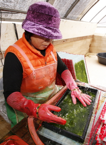 충남 태안군 이원면 사창리의 어민이 갓 수확한 감태를 손질하고 있다.