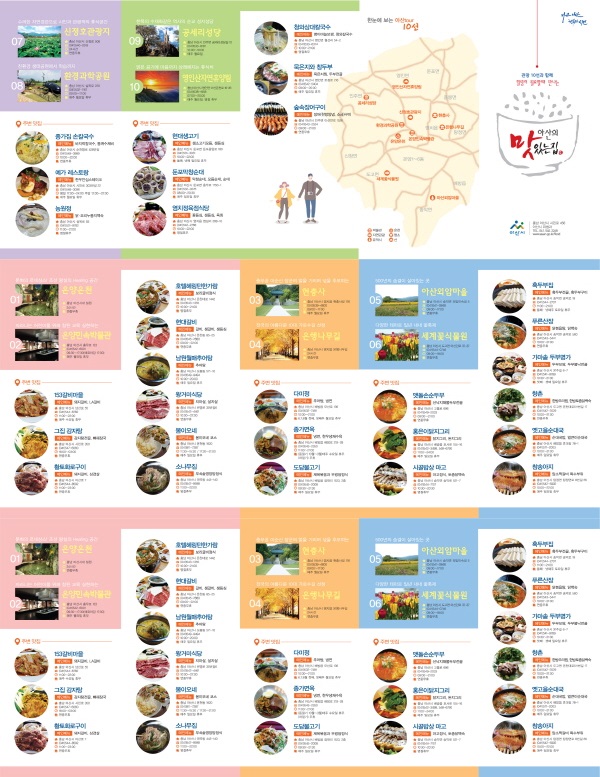 책자는 아산관광명소 10선 ‘현충사, 은행나무길, 온양온천, 온양민속박물관, 신정호관광지, 환경과학공원, 아산외암마을, 세계꽃식물원, 공세리성당, 영인산자연휴양림’의 풍경 사진과 함께 주변 대표맛집의 메인메뉴의 맛깔스러운 음식 소개 사진을 담았다.