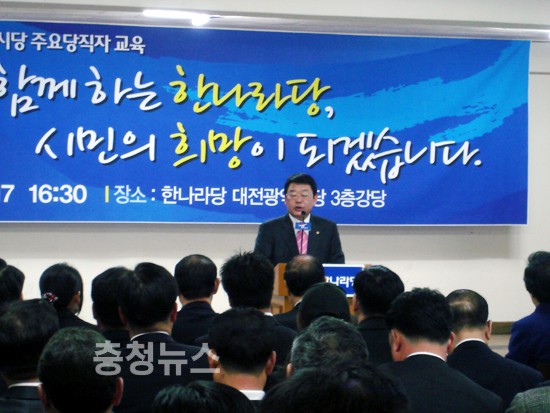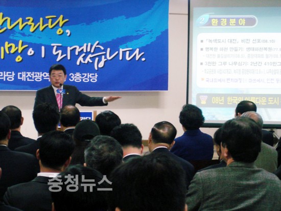 박성효 시장은 한나라당 당원들을 대상으로 한 특강에서 "대전이 녹색도시의 핵심적인 역할을 하고 있다"며 설명하고 있다.