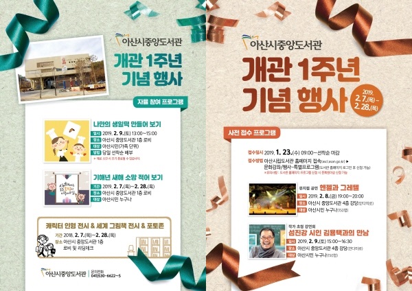 시립도서관은 행사기간 다양한 공연과 기념행사를 통해 주민 친화적 공간이자 지역커뮤니티 중심 역할을 하고 있는 아산시중앙도서관의 이미지를 확립할 계획이다.