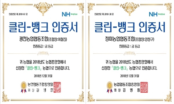 클린뱅크 인증 농·축협은 전국 1122개 중 314개 농·축협이 선정되었으며 이중 충남에서는 金등급에 광천농협·정미농협 2개소와 銀등급에 홍성농협 등 15개소, 銅등급에는 삽교농협 등 23개소 등이 ‘2018년 클린뱅크’로 선정되었다.