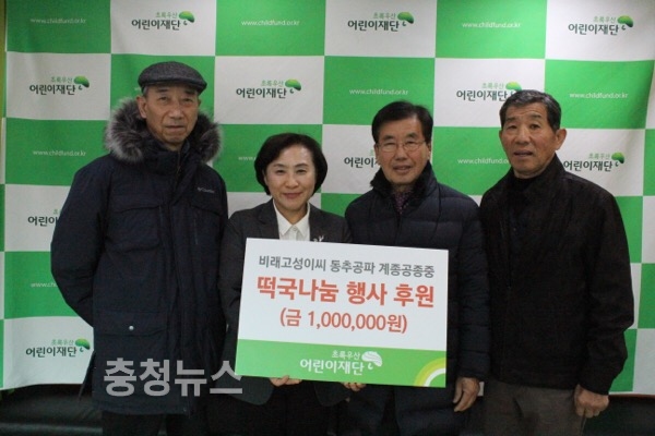 비래 고성이씨 계종공파 종중(회장 이형배)은 25일 초록우산 어린이재단 대전종합사회복지관(관장: 유미)을 방문하여 저소득가정 명절선물지원금 100만원을 기탁하였다.