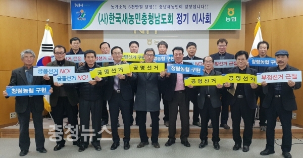 농협중앙회 충남지역본부(본부장 조소행)는 25일 (사)한국새농민충청남도회(회장 김기덕), (사)농가주부모임충남연합회(회장 김금자)와 공동으로 3월 13일 실시하는 전국농협조합장 동시선거에서 공정하고 깨끗한 선거를 치르기 위해 상호 협력하기로 다짐했다.