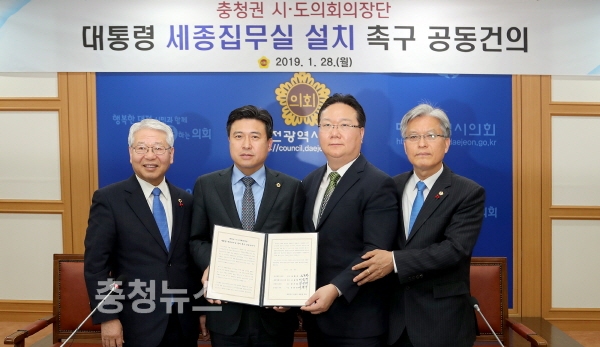 대전시의회 김종천 의장을 비롯해 세종시의회 서금택 의장, 충북도의회 장선배 의장, 충남도의회 유병국 의장 등 4명은 28일 오전 대전시의회 대회의실에서 '세종집무실 설치' 공동건의서를 채택했다.