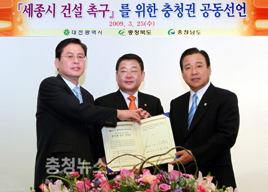 또 “충청권 3개 시도지사는 세종시 건설 등 지역현안 추진을 방해하는 어떠한 행위도 좌시하지 않을 것”이며 “충청권 현안 사업의 원활한 추진을 위해 일심동체가 돼 대정부 투쟁에 한목소리로 대응하는 등 충청권 공조를 강화하겠다”고 밝혔다.