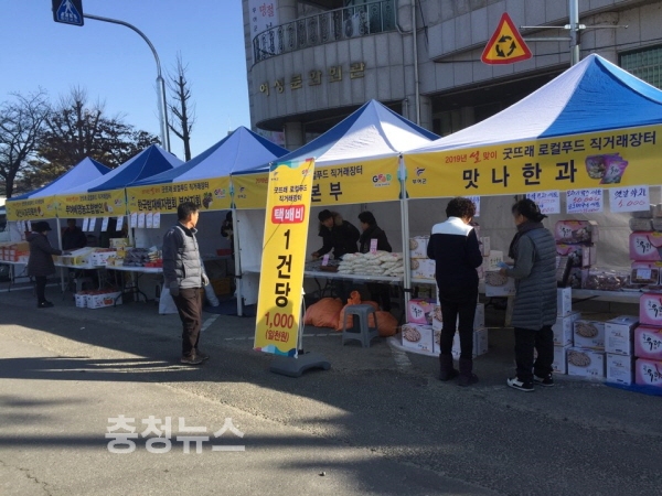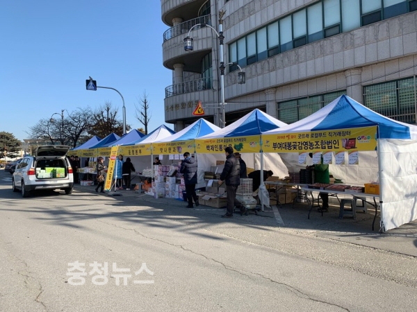 충남 부여군(군수 박정현)은 2019년 설 명절을 맞이하여 로컬푸드 판매 촉진은 물론 지역경제 활성화와 굿뜨래 푸드의 우수성을 부각시키기 위하여 부여군청 앞에서 29일 오전10시부터 오후5시까지 굿뜨래 로컬푸드 직거래 장터를 개최해 문전성시를 이뤘다.