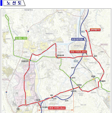 총 37.4㎞ 순환형인 2호선 노선은 서대전역~정부청사~유성온천역~진잠~서대전역 등으로 계획됐다.