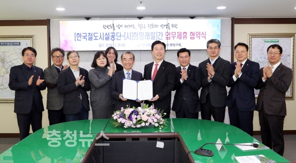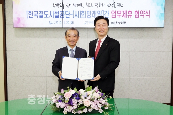 한국철도시설공단(이사장 김상균)은 (사)희망래(來)일(이사장 이철)과 29일 철도공단 수도권본부(서울시 용산구 소재)에서 남북철도연결 등 통일기반 공익사업의 상호협력을 위한 업무협약(MOU)을 체결했다고 밝혔다.