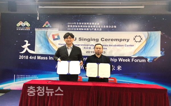 23일 국립 한밭대학교 창업보육센터(센터장 김건우, 사진 좌측)가 중국 심천에서 대공방(대표 ALLEN, 사진 우측)과 MOU를 체결하고 기념촬영