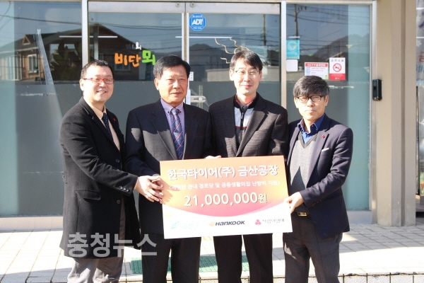 한국타이어(대표이사 조현범)는 29일 충남 금산군 제원면사무소에서 김창섭 제원면장, 이신희 제원면 노인회장, 이훈 충남사회복지공동모금회 모금사업팀장, 강석 한국타이어 금산공장 경영관리팀장 등이 참석한 가운데 제원면에 난방비 2100만원을 전달했다.
